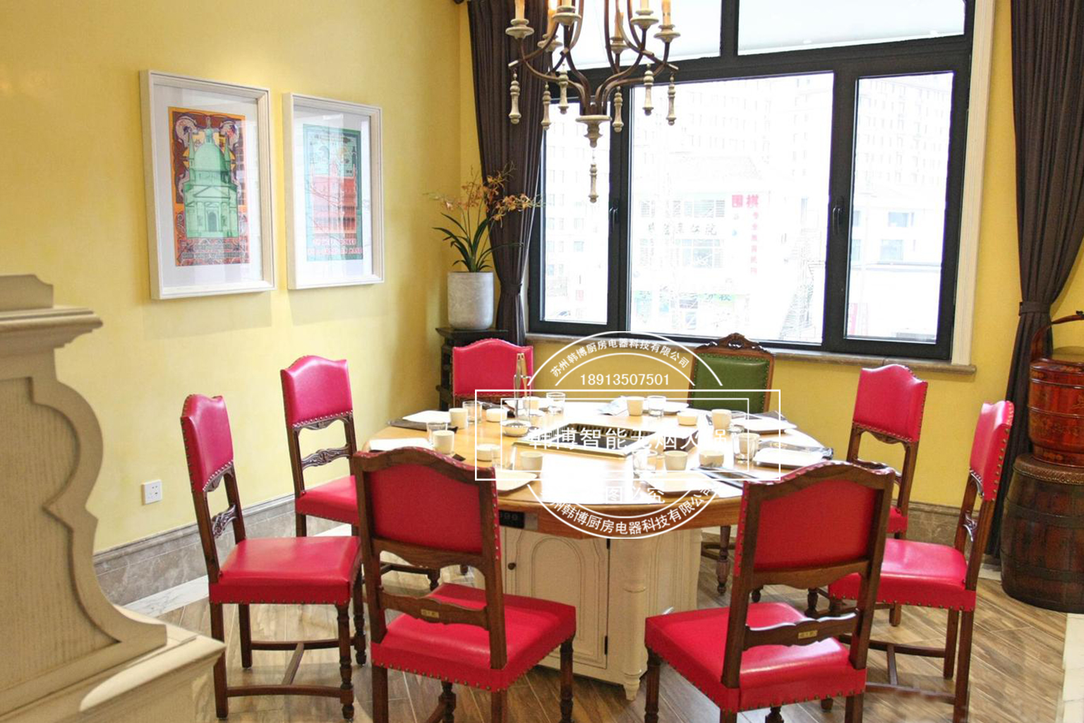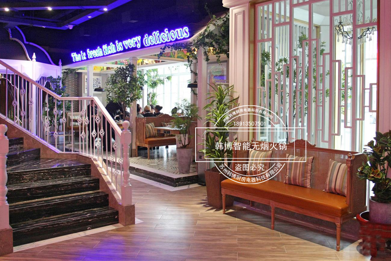 店內(nèi)的裝修也是很時(shí)尚,這里到處都是能讓人賞心悅目的裝飾,特別溫馨浪漫,精心的布置、但細(xì)節(jié)更動(dòng)人!因?yàn)樵谶@你看不到油煙四處升騰的現(xiàn)象,這一切都是由于使用了韓博智能無(wú)煙火鍋設(shè)備油煙凈化系統(tǒng)讓油煙魔力般的往下吸走,吸油煙率高達(dá)99%,從而營(yíng)造了一個(gè)溫馨時(shí)尚的就餐環(huán)境。