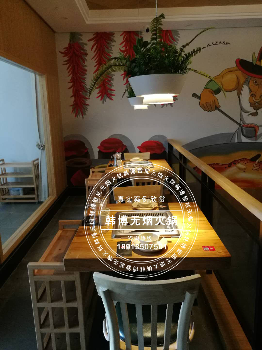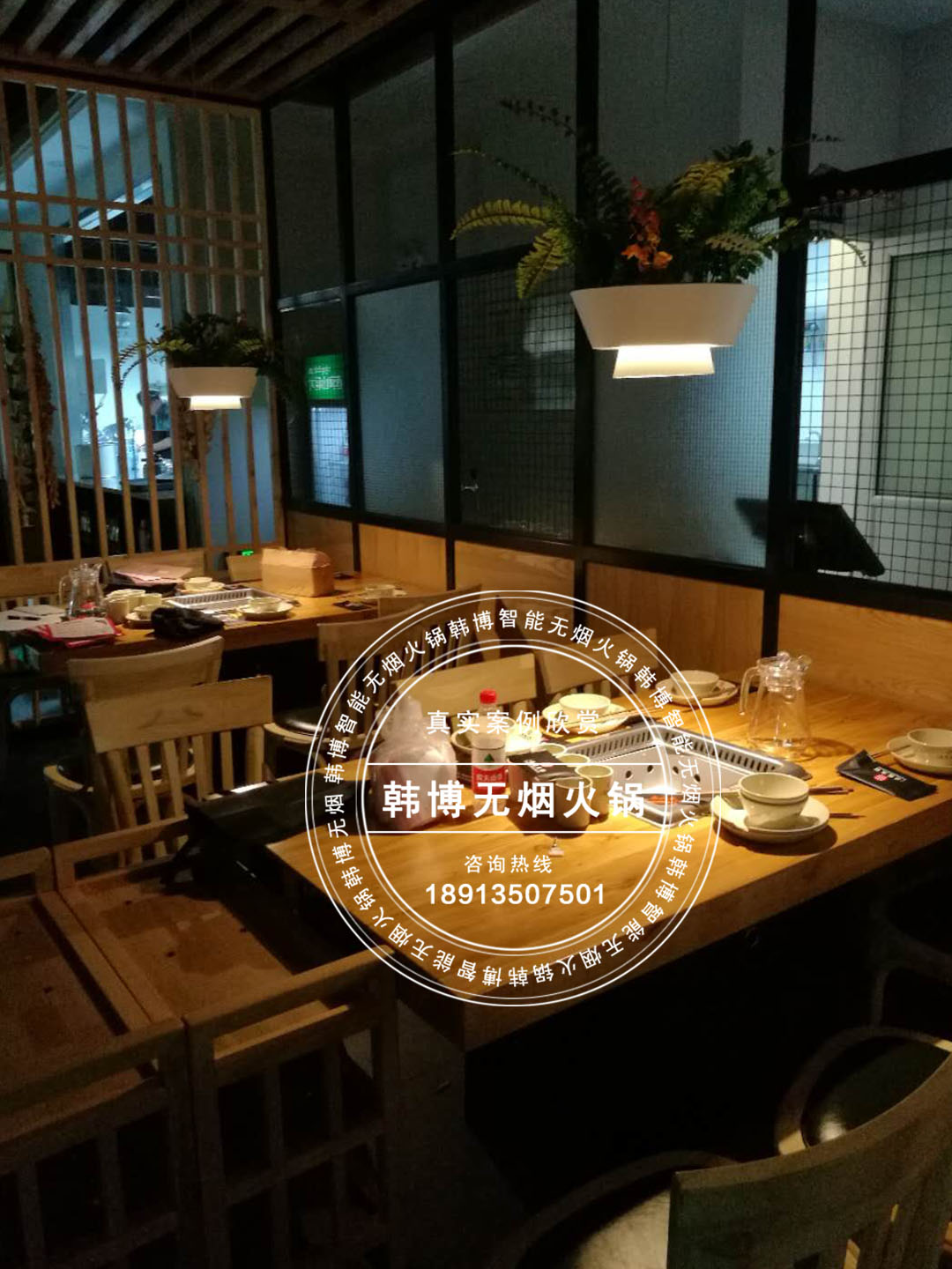 因為每張桌子都安裝了韓博智能無煙火鍋桌和油煙凈化系統(tǒng),在這舒適而又別出心裁的環(huán)境中,顧客可以安逸無拘束的吃著火鍋。韓博無煙火鍋采用定制雙風(fēng)輪低噪音風(fēng)機,噪音控制在56分貝以下,油煙吸凈率高達99%以上。